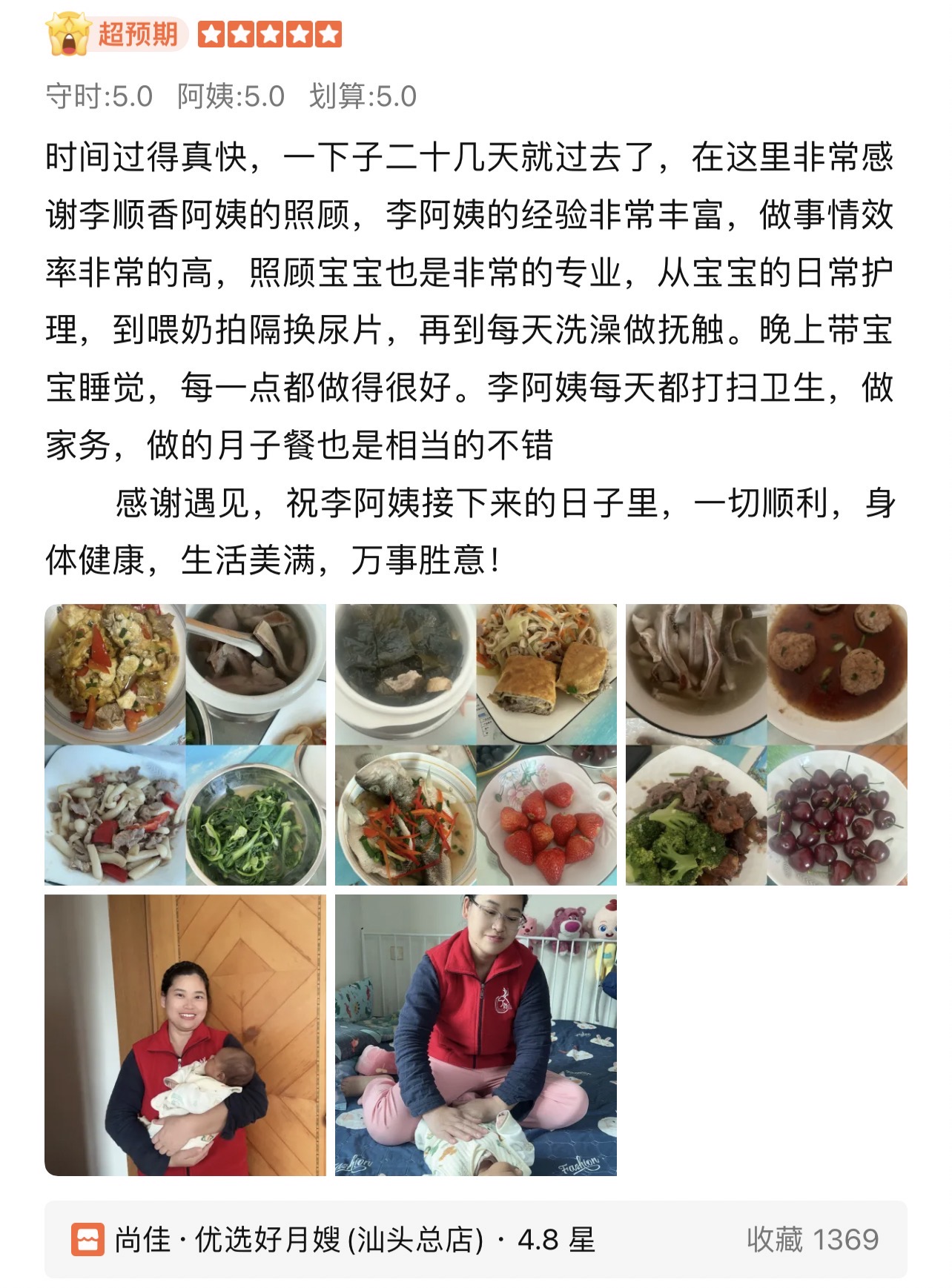 李姐來(lái)自湖南, 性格比較開(kāi)朗,善于溝通。從事月嫂工作以來(lái)得到很多服務(wù)過(guò)的家庭的認可,并獲得好評,錦旗,她平時(shí)做事認真負責,對于母嬰護理工作有豐富的經(jīng)驗,同時(shí)具有良好的服務(wù)意識和科學(xué)育嬰方法,擅長(cháng)乳房護理,新生兒臍部,臀部護理以及新生兒常見(jiàn)狀況觀(guān)察和處理,盡心盡責似家人,盡心呵護小寶寶,這也是顧客給予她的服務(wù)評價(jià),也是她從事月嫂工作一直秉持的服務(wù)態(tài)度,希望她能用她的專(zhuān)業(yè)技能為您和您的寶寶度過(guò)一個(gè)幸福美滿(mǎn)的月子期!